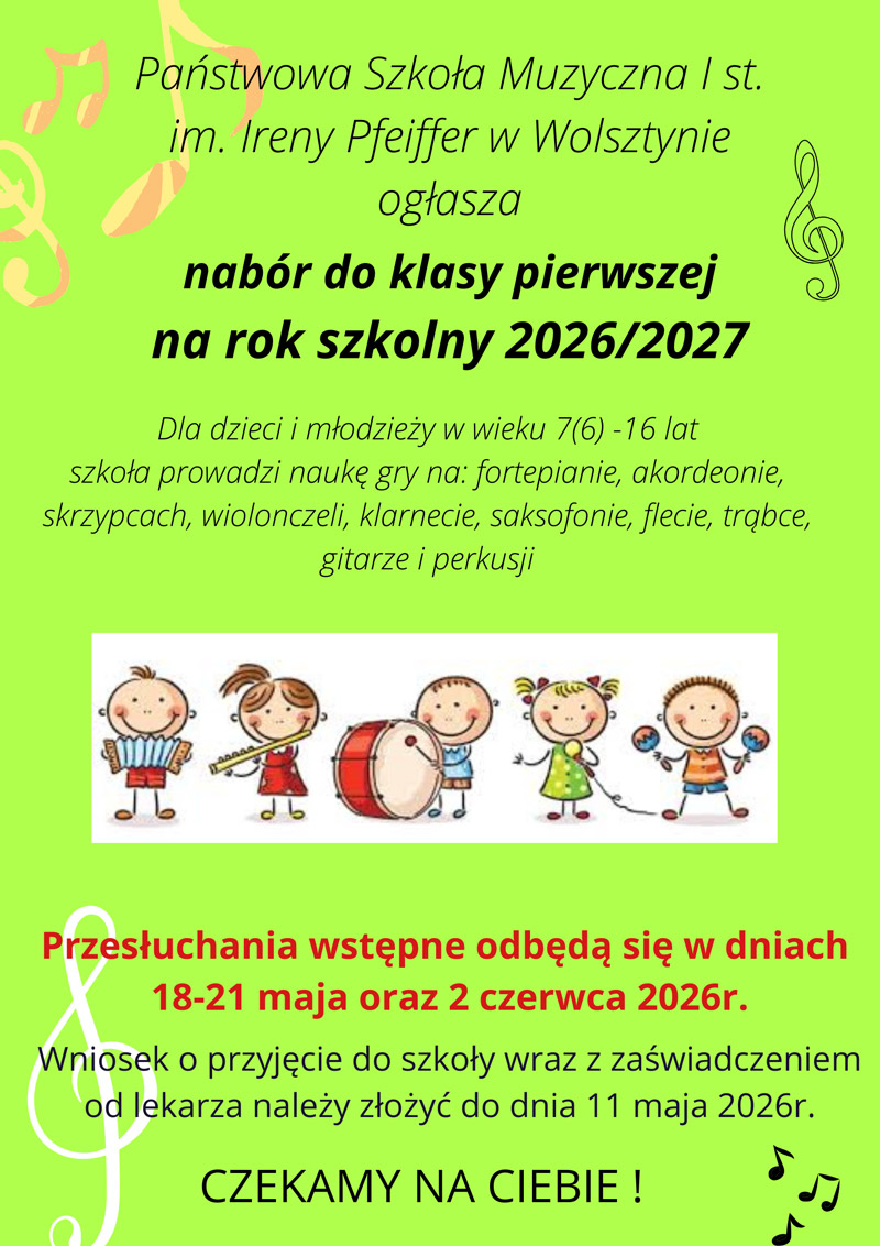 Państwowa Szkoła Muzyczna I st. im. Ireny Pfeiffer w Wolsztynie ogłasza nabór do klasy pierwszej na rok szkolny 2026/2027.