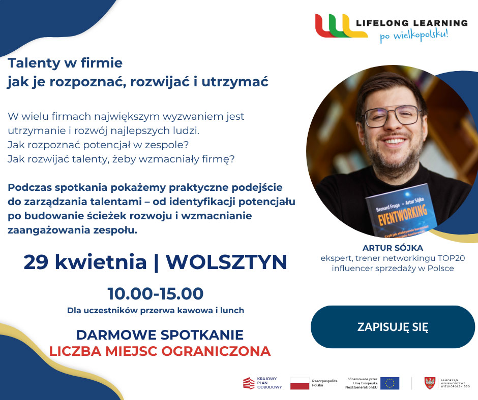 W środę (29.04) w godz. 10.00-15.00 w hotelu Fala Park w Wolsztynie odbędzie się spotkanie dla przedsiębiorców i kadry zarządzającej „Zarządzanie talentami w zespołach międzypokoleniowych. Talenty w firmie: jak je rozpoznać, rozwijać i utrzymać”.