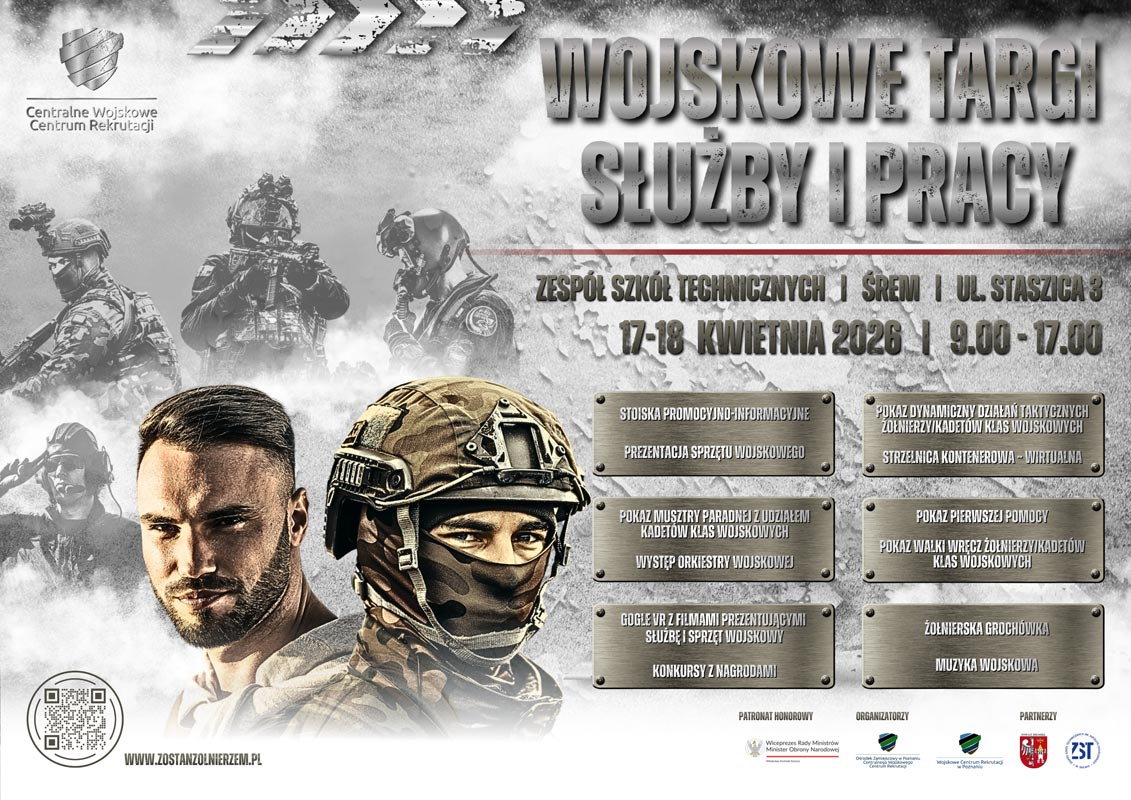 Ministerstwo Obrony Narodowej oraz Centralne Wojskowe Centrum Rekrutacji w 16 miejscowościach w całym kraju, po jednej w każdym województwie organizują kolejną edycję Wojskowych Targów Służby i Pracy. W województwie wielkopolskim przedsięwzięcie to będzie miało miejsce w Zespole Szkół Technicznych im. Hipolita Cegielskiego w Śremie przy ul. Stanisława Staszica 3 oraz w przylegającej do szkoły hali sportowej Śremskiego Sportu. Wydarzenie to odbędzie się w piątek i sobotę (17-18 kwietnia) w godzinach od 9:00 do 17:00.