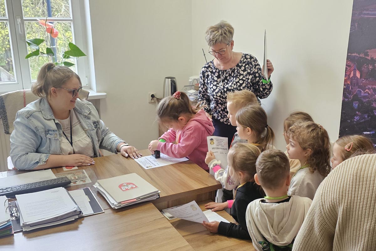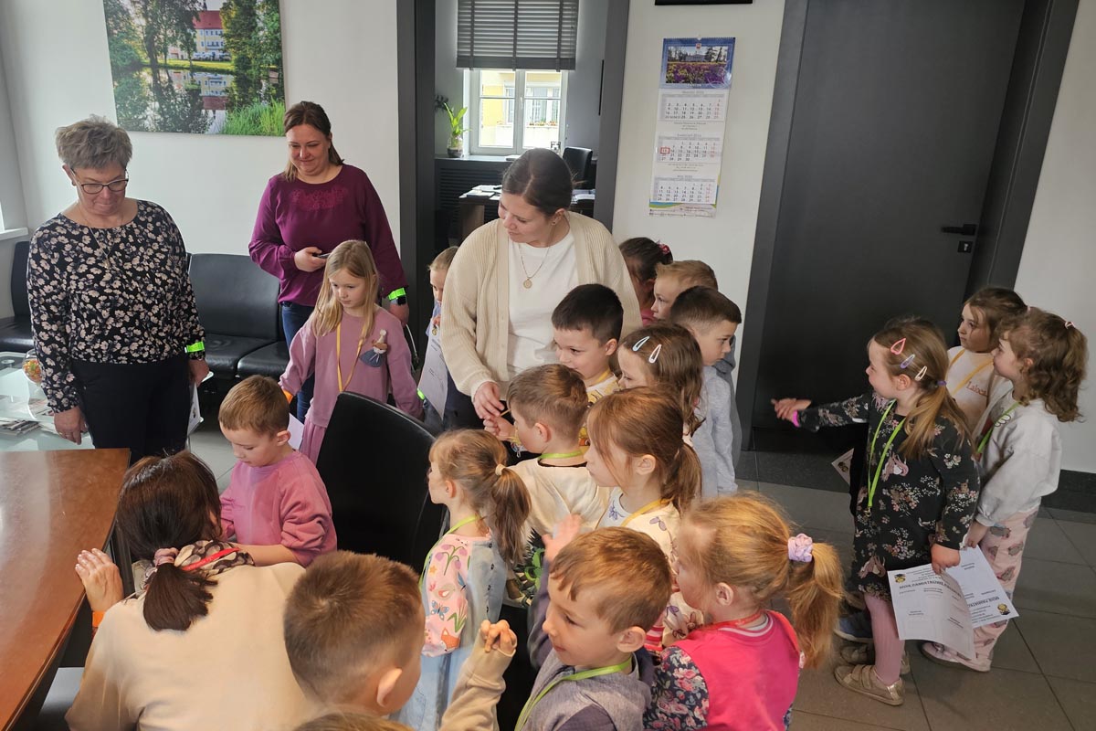 Po krótkiej rozmowie dzieci ruszyły na wycieczkę po budynku. Każde odwiedzone miejsce oznaczało kolejną pieczątkę na pamiątkowej kartce. Przedszkolaki zajrzały do wydziałów komunikacji i finansów, kadr, sekretariatu oraz biura podawczego. W każdym z tych miejsc mogły zobaczyć, jak wygląda codzienna praca urzędu i jak wiele osób dba o sprawy mieszkańców.